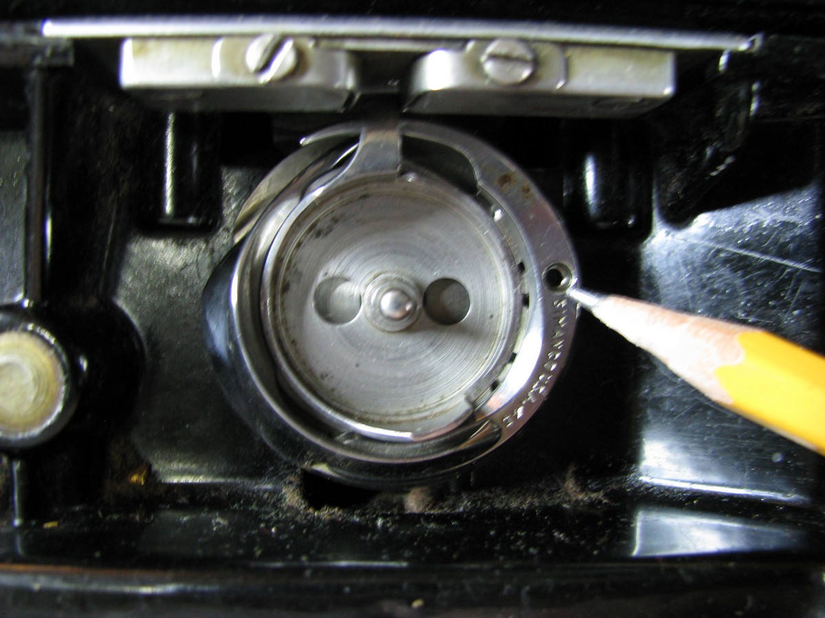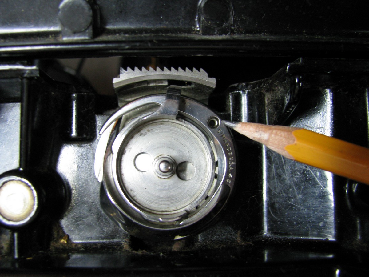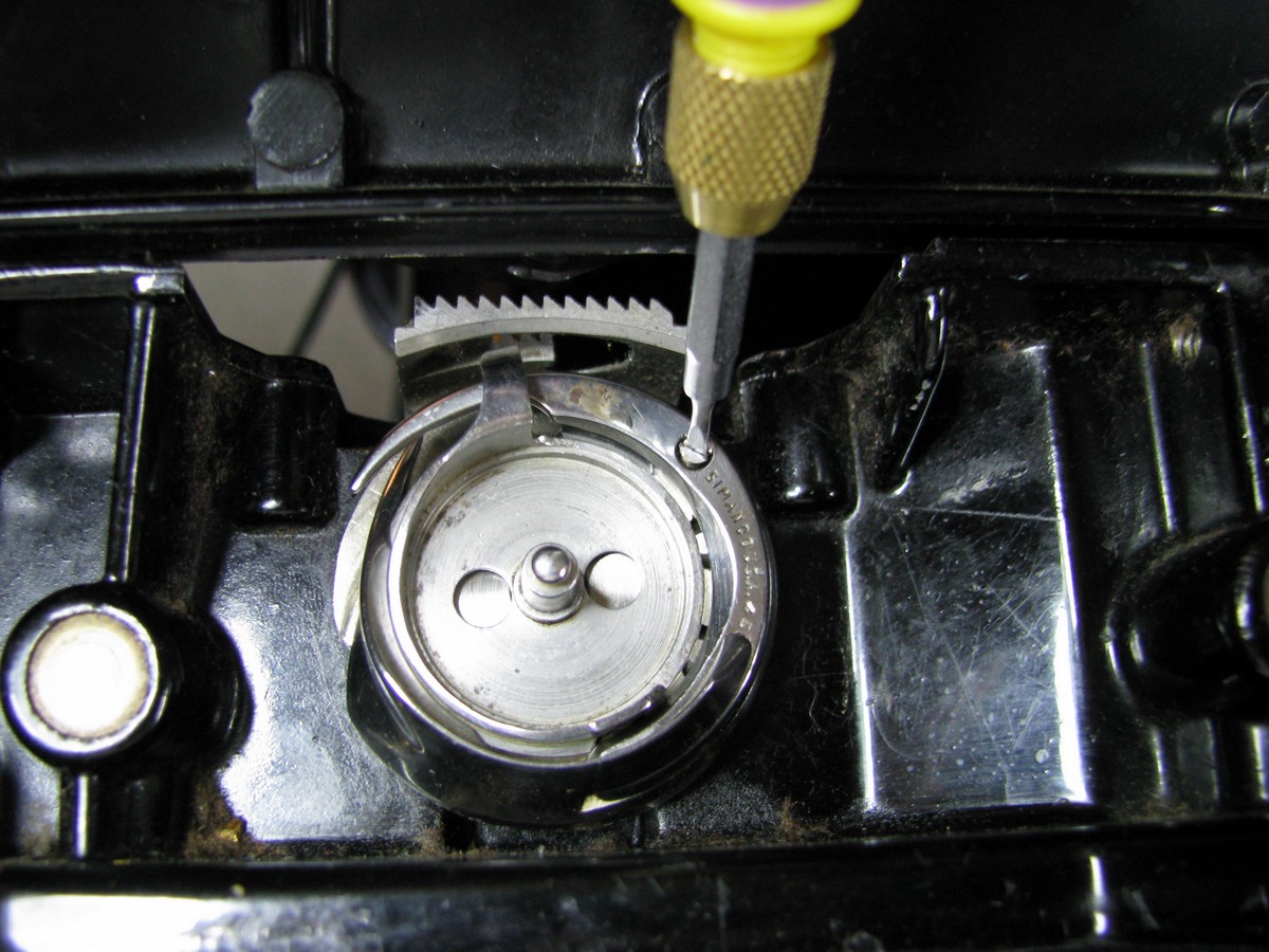 With Bobbin Case removed, remove this small screw (called the Rotating Hook Gib screw)