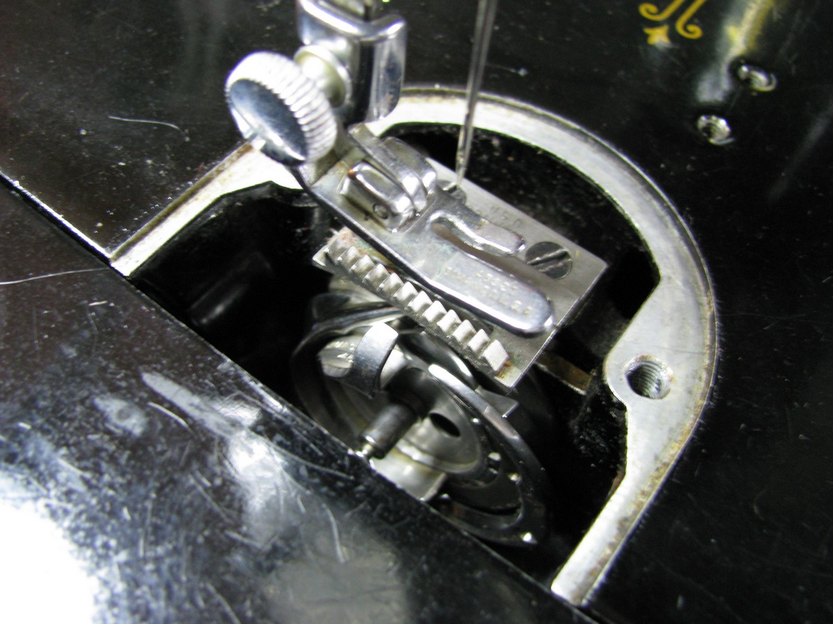 THIS IS VERY IMPORTANT! Make sure that the finger of the Bobbin Case Base is properly positioned between the Bobbin Case Position Springs on the bottom of the Needle Plate. Failure to ensure this is properly installed is the cause of the majority of stitch problems with Featherweights!