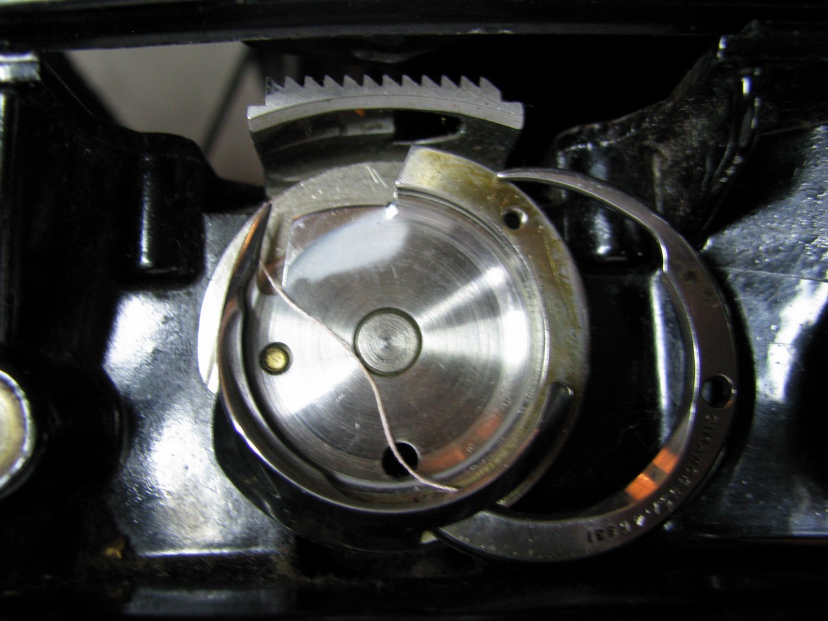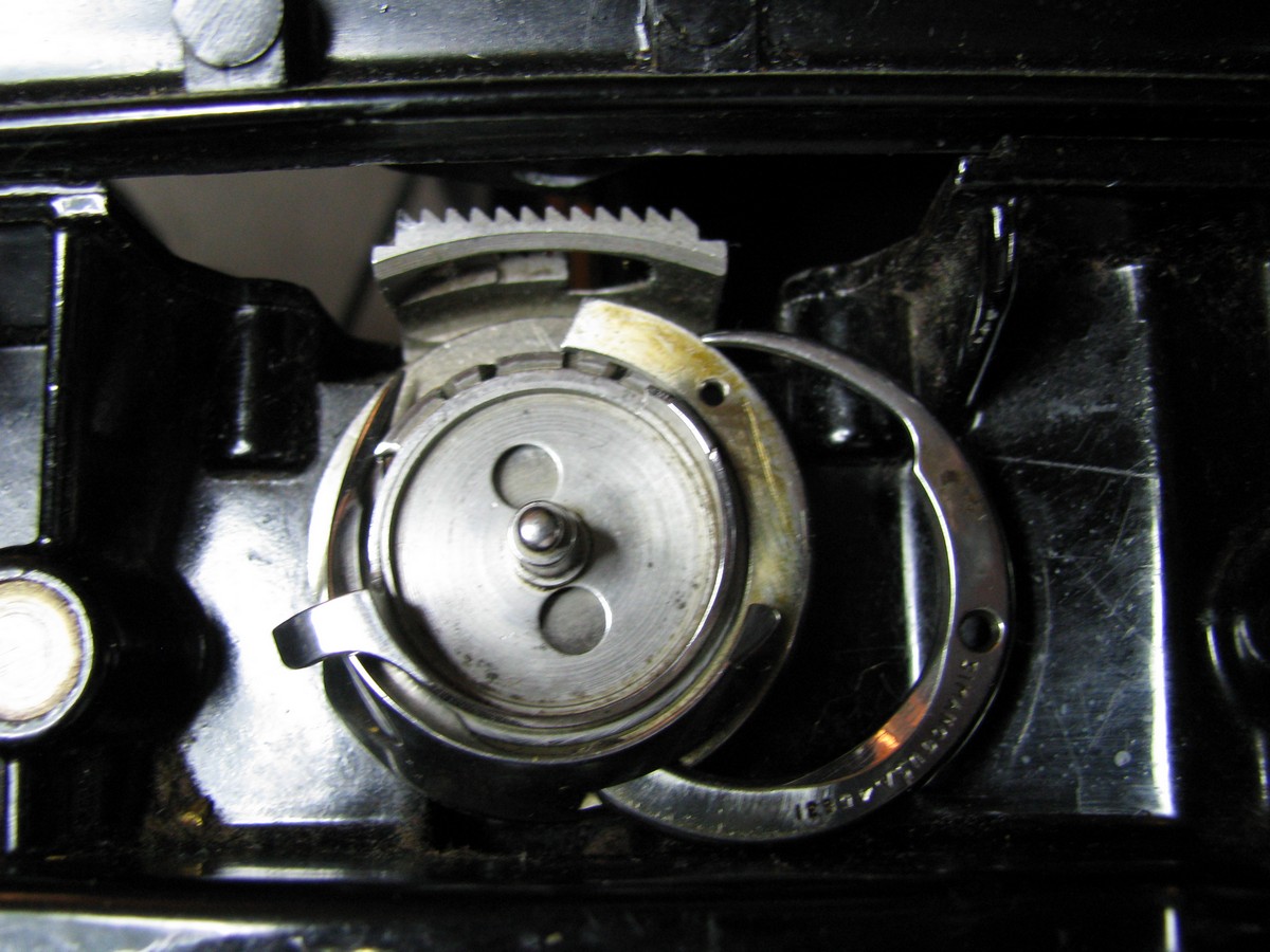 It is also a good idea to place a drop or two of sewing machine oil on the Bobbin Case Base before assembling onto the Rotating Hook. Replace Bobbin Case Base, aligning as shown above. Once it is in place and properly seated, it should spin freely on the Rotating Hook.