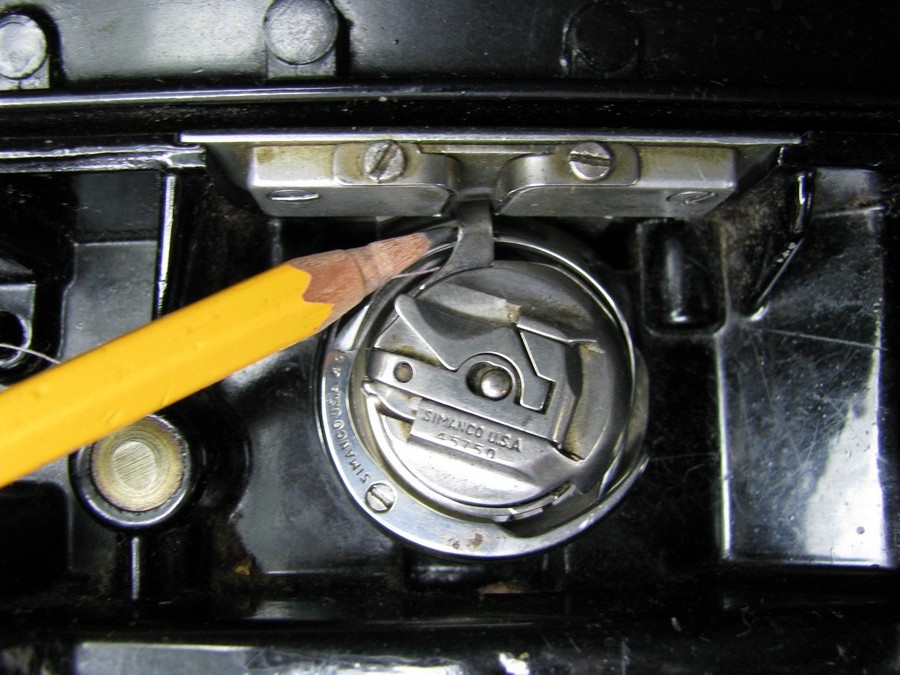 Thread Jams – Machine is stuck and won’t turn or there is a crunching sound when the needle move up and down. YOU CAN FIX THIS YOURSELF! The following will take you step by step to remove thread jams in the Rotating Hook area.