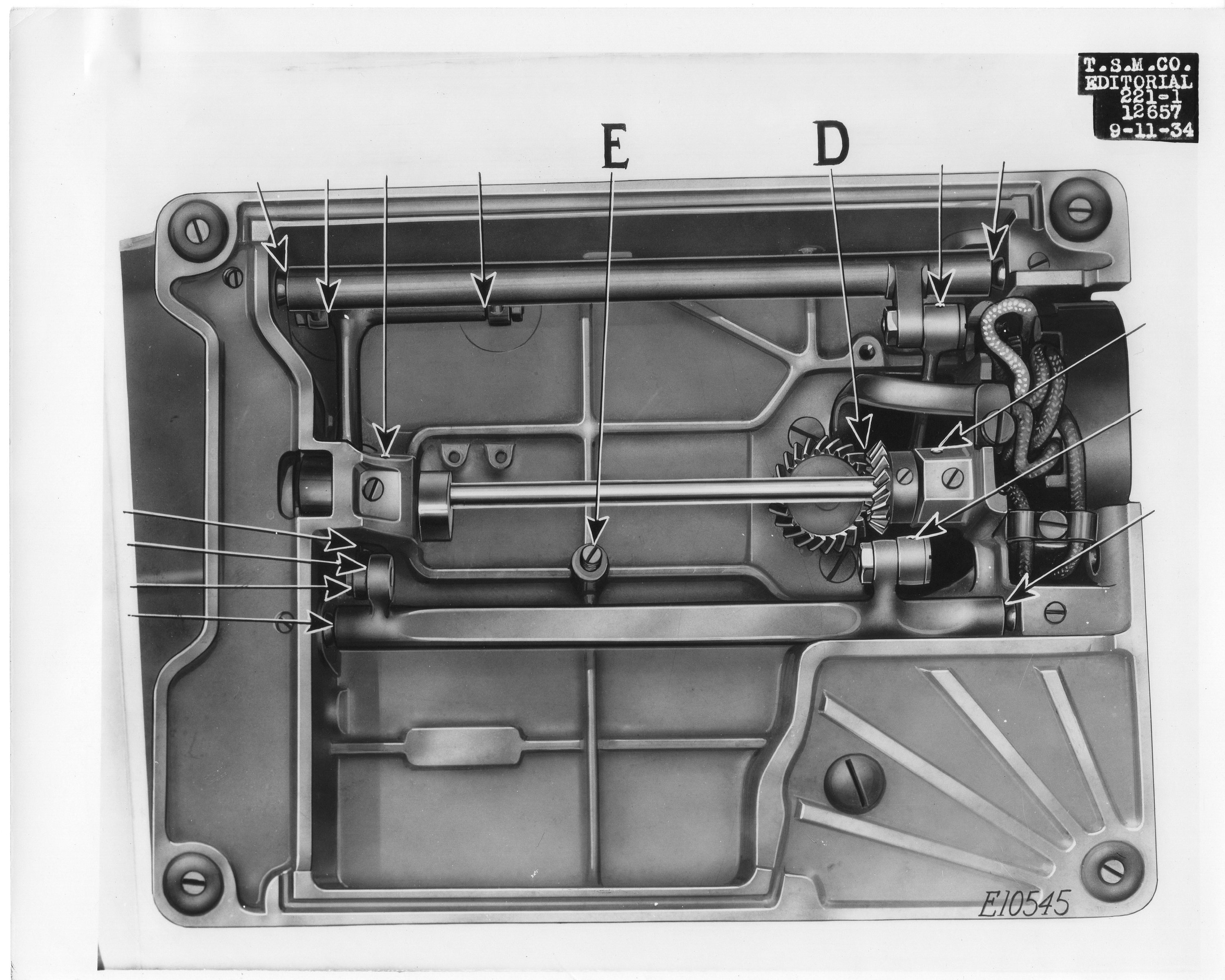 PICTURE # E10545 This picture on Page 26 is in EVERY 221 Manual from NOVEMBER 1933 to The Last Blue Manual of (655)..Showing the Old SPLIT BASE Machine with the Original 1933 SERIAL NUMBER BASE. Which by (1038) They Were Both Removed and updated....