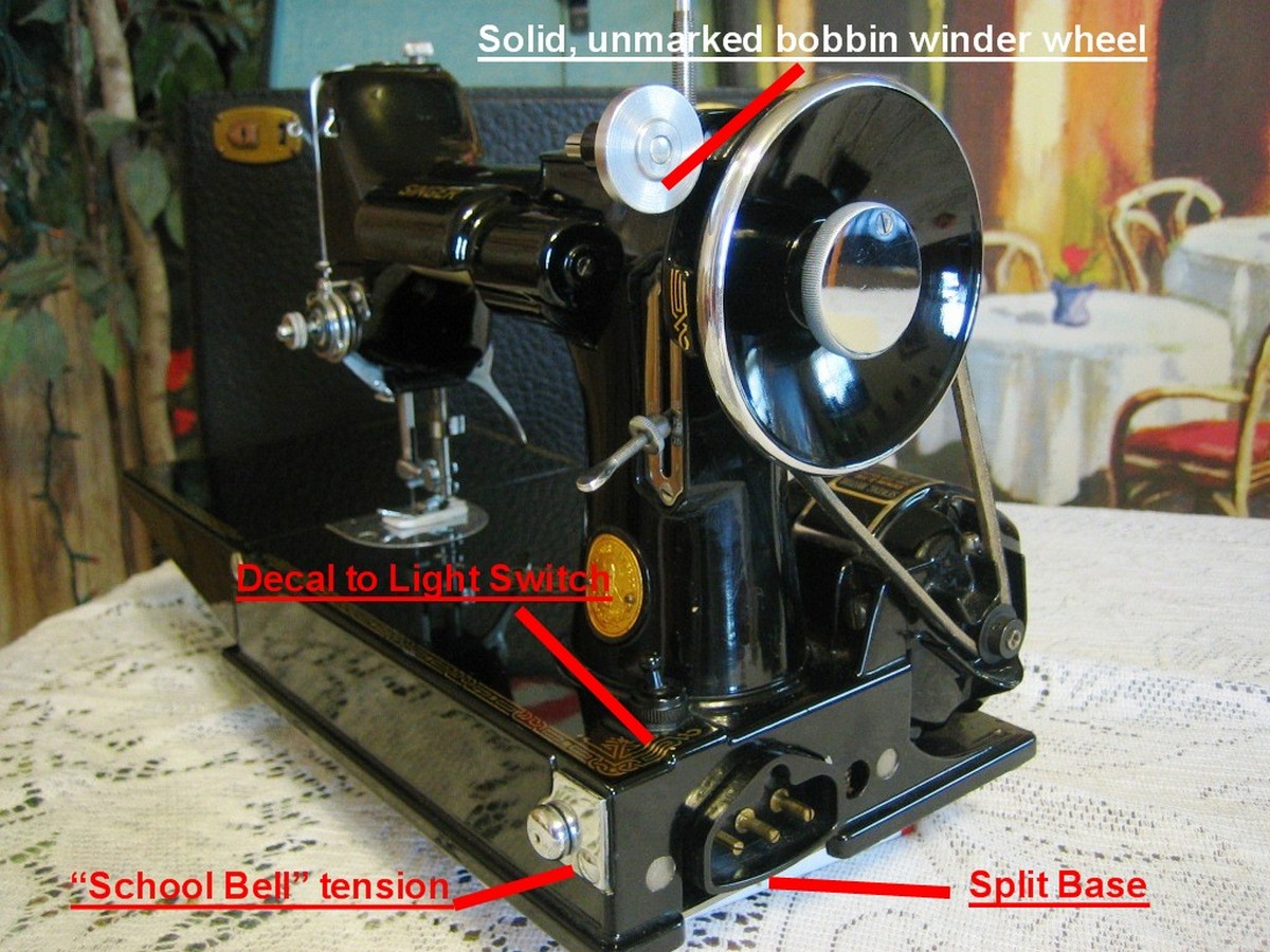 When your find or want to rebuild one of these beauties, you have to pay attention to what your looking at and for. Don't get all happy faced and let slick sellers get one over on you. NOTE the SPLIT BASE, The DECAL to the LIGHT SWITCH, and the SMALL SOLID, Un-Marked Bobbin Winder Wheel.