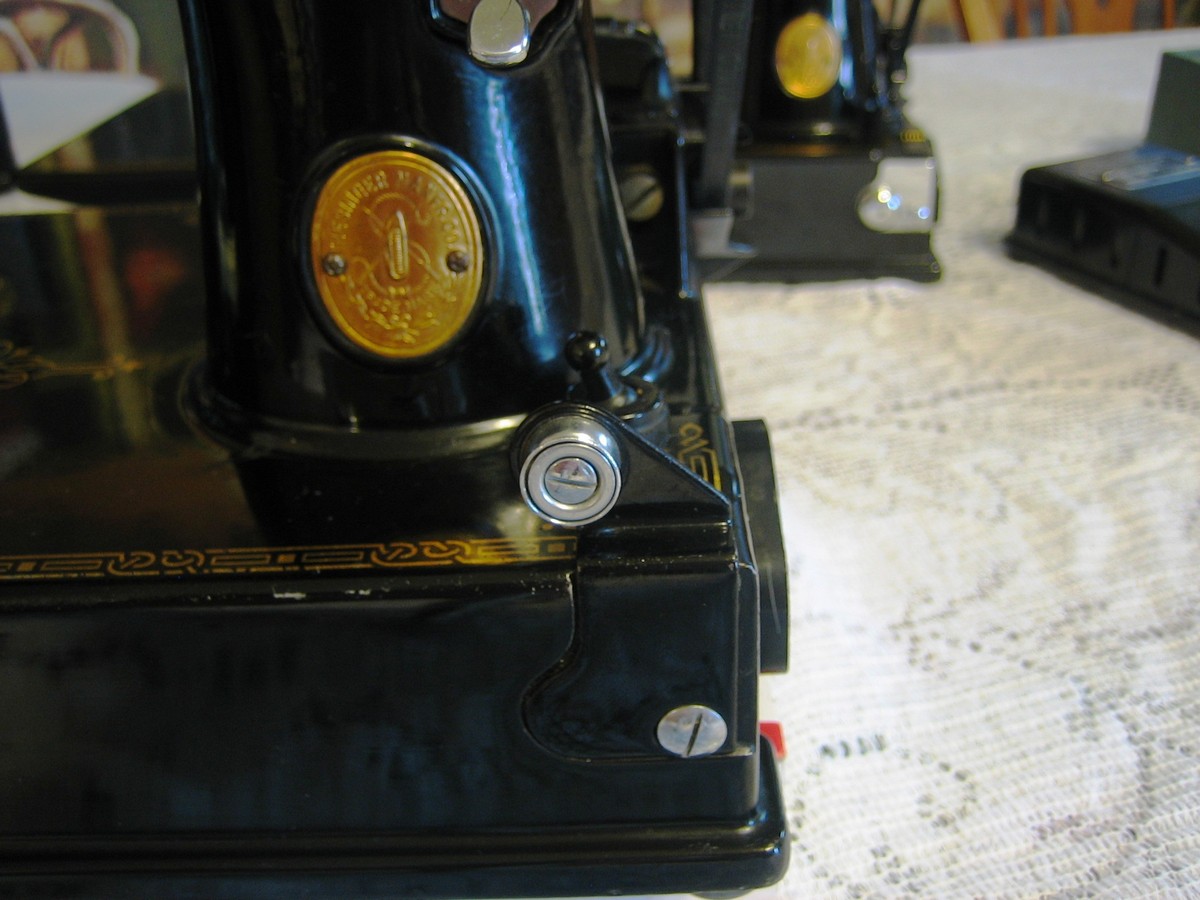 These were on ALL AD SERIES 221. The CHROME Side Mounted Bobbin Winder Guide (School Bell) was on ALL 1933 and most 1934 and 1935 AD SERIES. You can also find many AD SERIES with a Black Side Mounted Bobbin Winder Guide. DON'T know if these were Original at that era or where used to replace Broken Chrome tensions as the School Bell was pretty fragile. Another possibility is it was added as an aftermarket part to allow the machine to fit into the card table style sewing table introduced not too long after the 221 was produced.