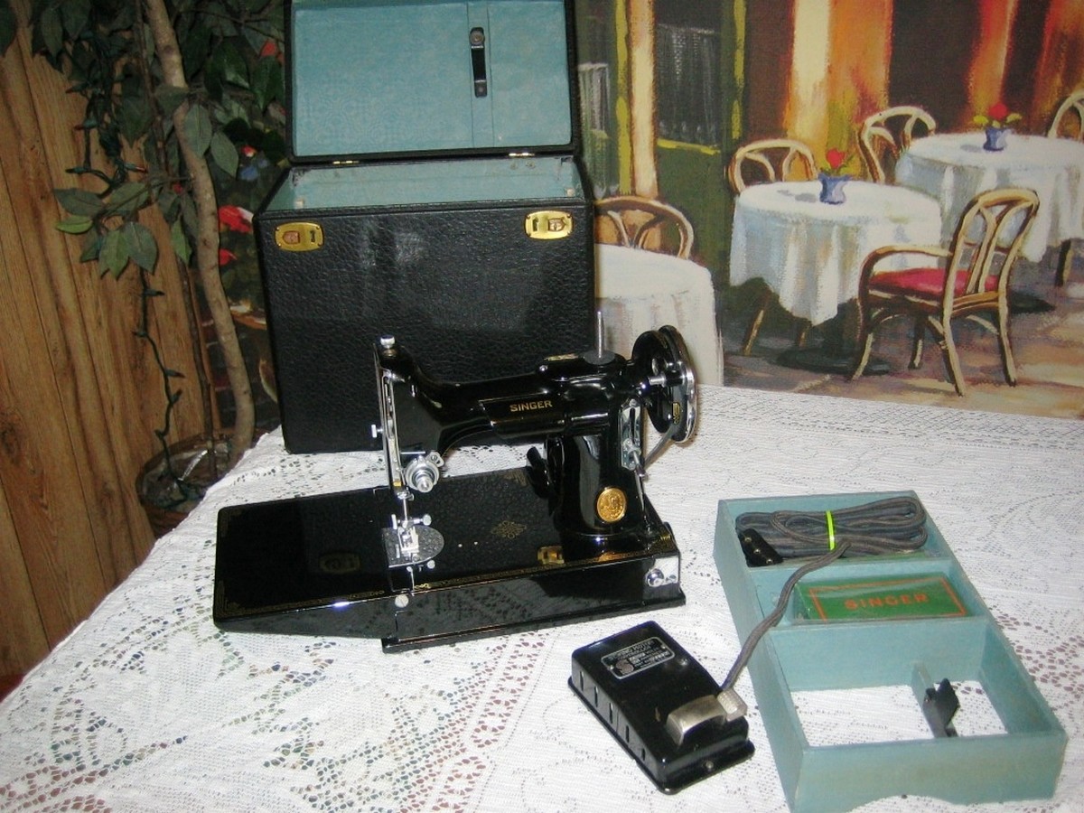 TYPE 1 CASE (below). Here is the machine with a TYPE 1 Case, NOTE the Hold Down Bracket on the Lid and the TRAY with the Large Hole in it. THIS is the ONLY thing the 221 has in common with the SEWHANDY. The TYPE 1 Case was around for most of the AD54XXXX Machines. By late AD54XXXX the TYPE 2 Case began in INTERMIX with TYPE 1 until they were all used up. The TYPE 2 Case was Identical to the T 1 Except Singer Removed the Lid Bracket and Got rid of the Hole in the Tray.