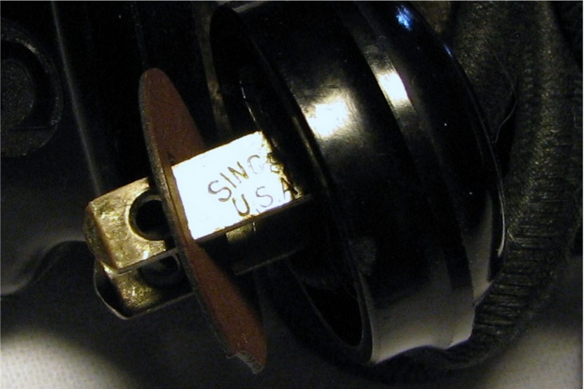 IN the picture below, note the “SINGER” Decal placed high on the light, and the Unnumbered Thread Tension. This again is Original on ALL AD SERIES. The BUD Decal on the machine bed was on, OUR GUESS, 200 or less of the first 221s. REMEMBER AD541705 or # 159 has the full up dated decal on its bed.