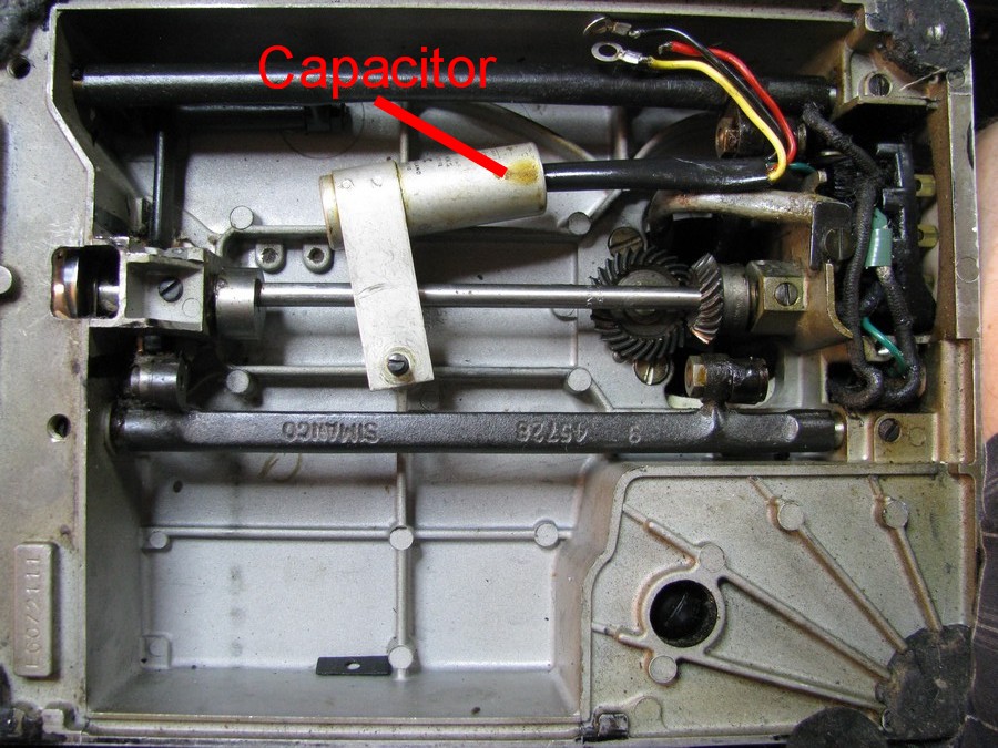 I have been getting some email recently regarding Featherweights that continue to run without the foot pedal being depressed, so I thought I would add a “Troubleshooting Tip” on this topic. Back in days of black and white televisions, you may recall the picture having “snow” whenever the vacuum cleaner was running nearby, or when you were sewing on your Featherweight. To help alleviate this interference, Singer used some capacitors to help filter the “noise” generated from the electric motors on their sewing machines. Capacitors are silver colored can shaped devices and are shown in the photos below. Well, over time these capacitors can leak or otherwise fail, sometimes creating a “sneak path” for the electrical power and allowing the machine to run on its own. The solution is easy, and with today’s modern electronics, these noise suppression devices are no longer necessary.