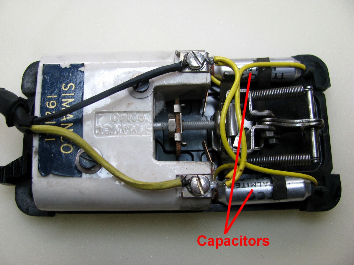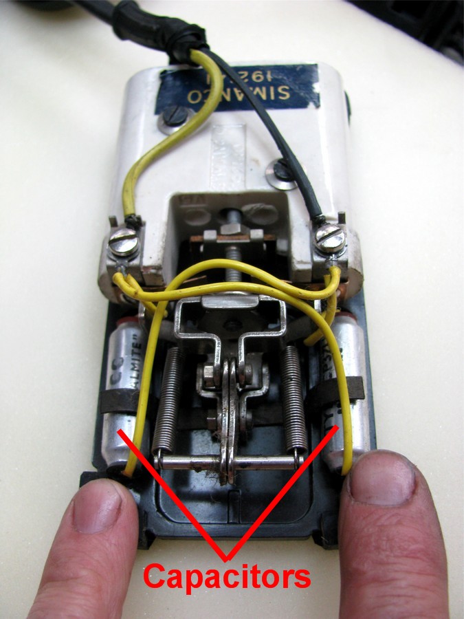 In the photos below you will see the foot control with the cover removed revealing 2 capacitors.