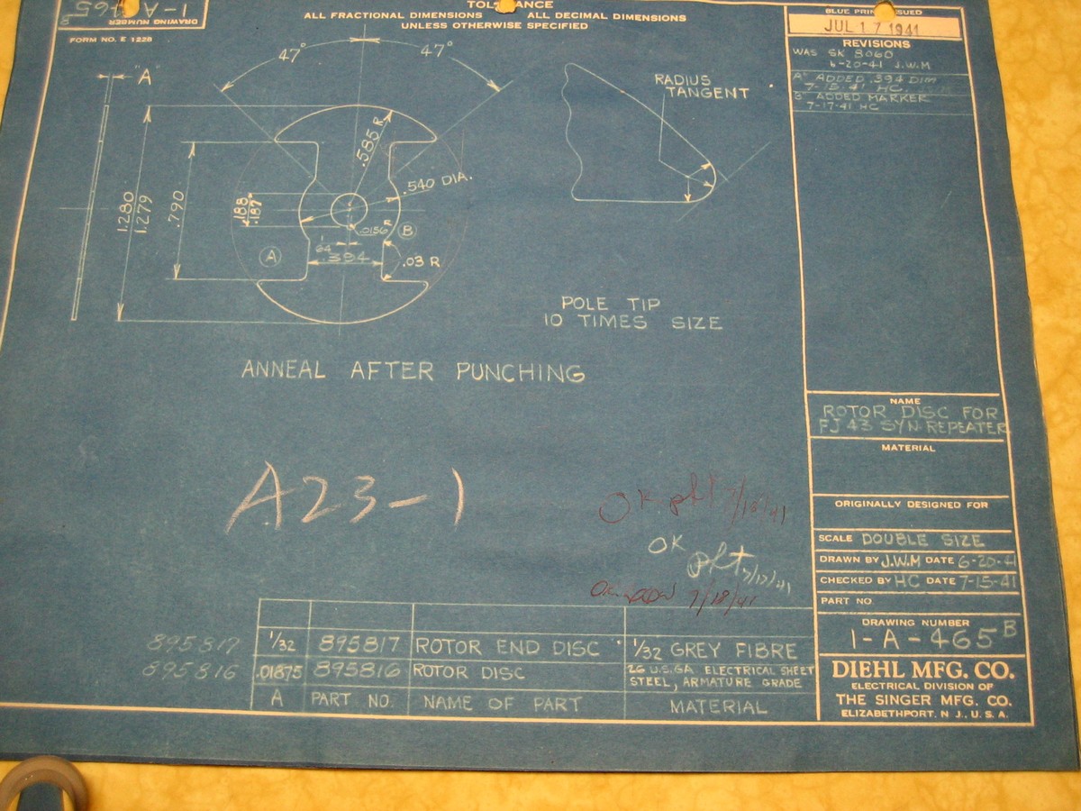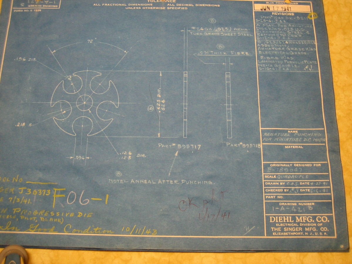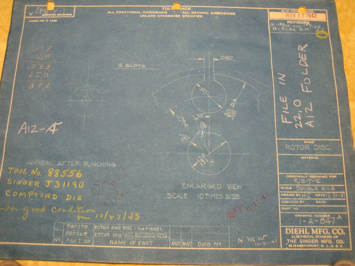 For the collector who thought they had everything. These are real pre WWII Blue prints, From the DIEHL MFG CO. This was the Electrical Division of The SINGER MFG CO. Philip Diehl was the man behind the Singer sewing machine motors. Four things make these blue prints very rare, Pre WWII, DIEHL, SINGER and Elizabethport N.J. These blue prints are in almost mint condition, original, and in letter size (8.5" x 11.0") format. We only have a handful and when they are gone there won't be anymore......... Make an offer!